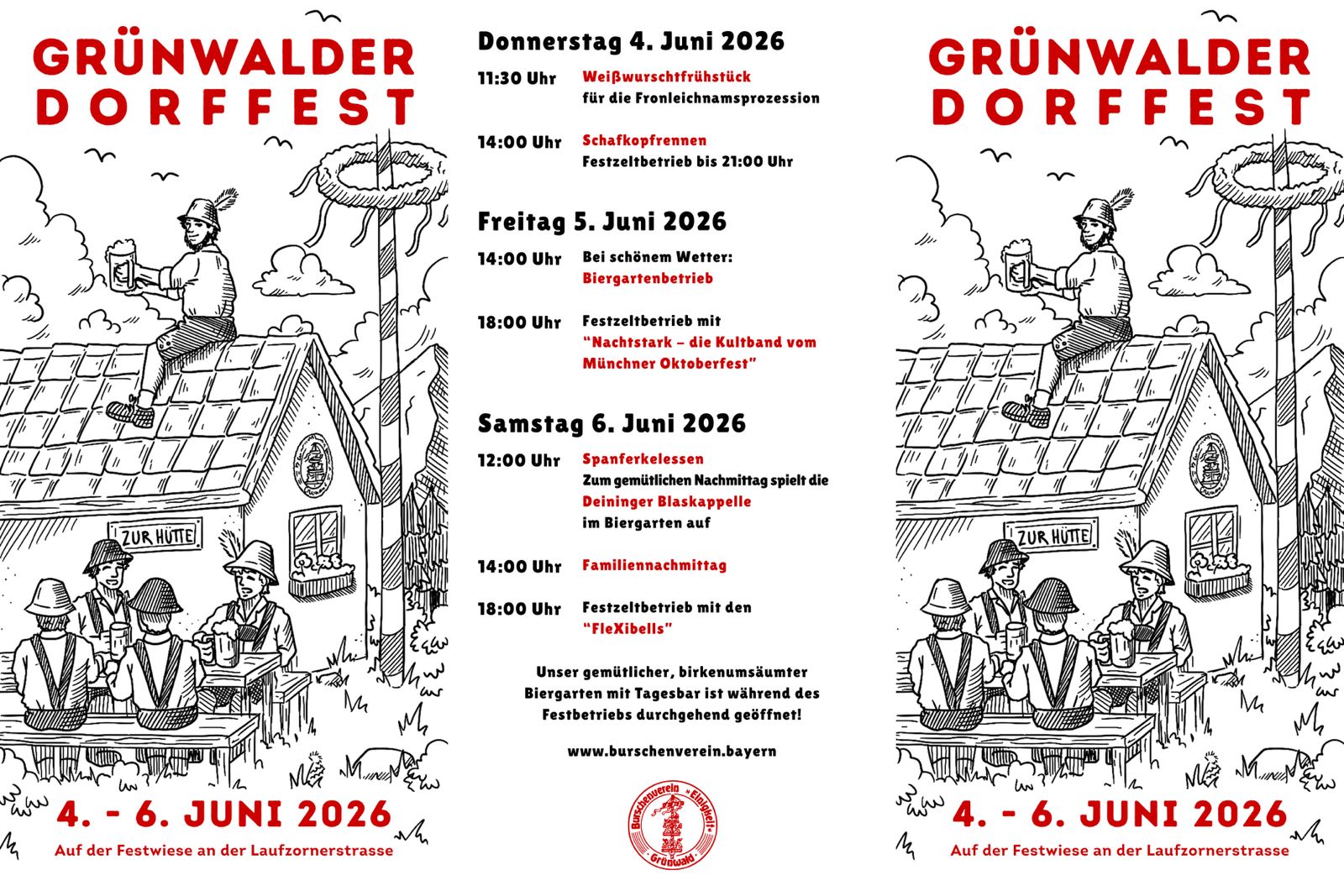 Zum Start unseres diesjährigen Dorffestes starten wir um 11:30 mit einem gemütlichen Weißwurstfrühstück. Begleitet wird das Fronleichnams-Weißwurstfrühstück von der Grünwalder Blaskapelle. Bei passendem Wetter ist der Biergarten inklusive Biergarten-Ausschank den gesamten Tag für Euch geöffnet.